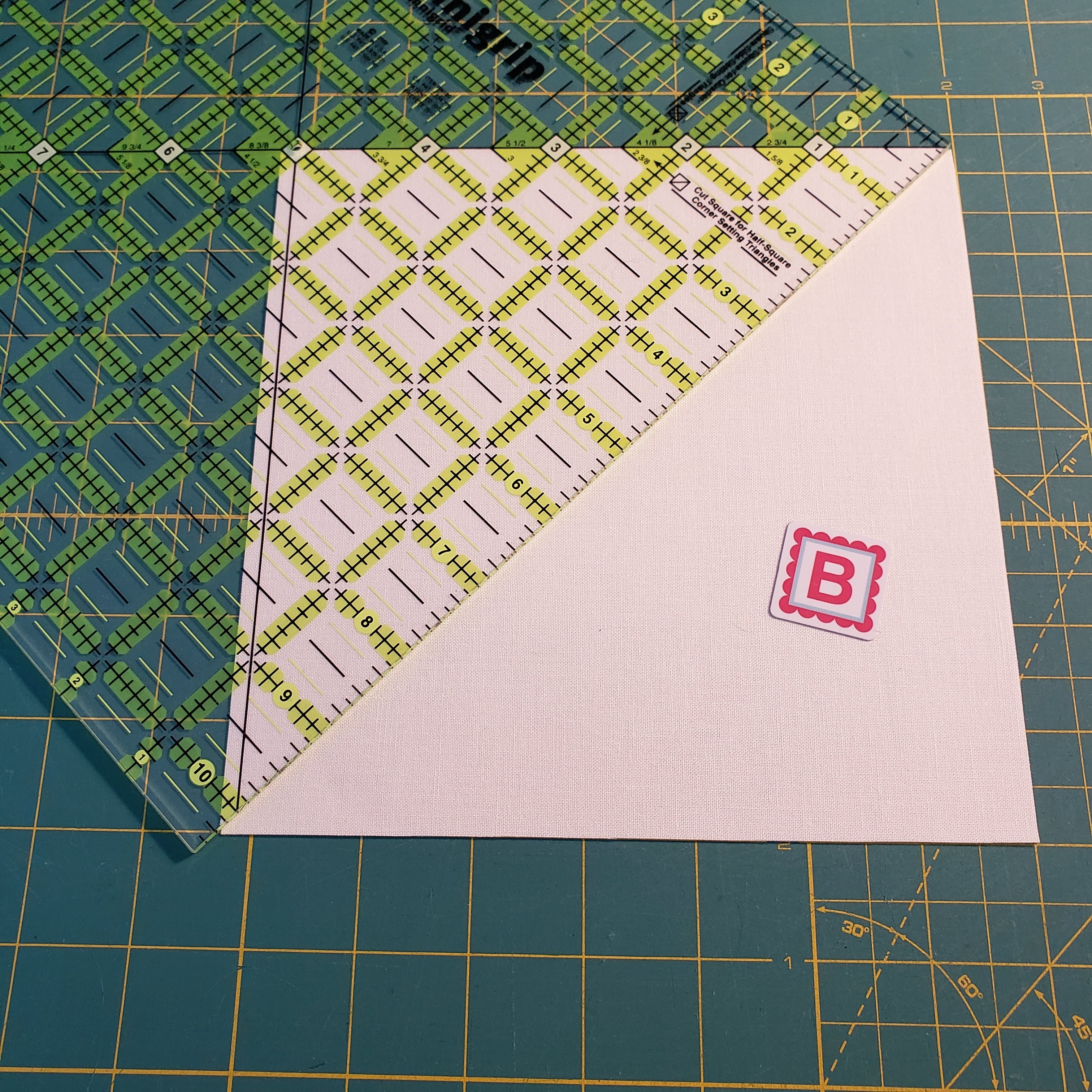 For the B triangles you will cut 2 squares at 7 1/4 " from your light fabric. Cut each of these squares once on the diagonal, like this: